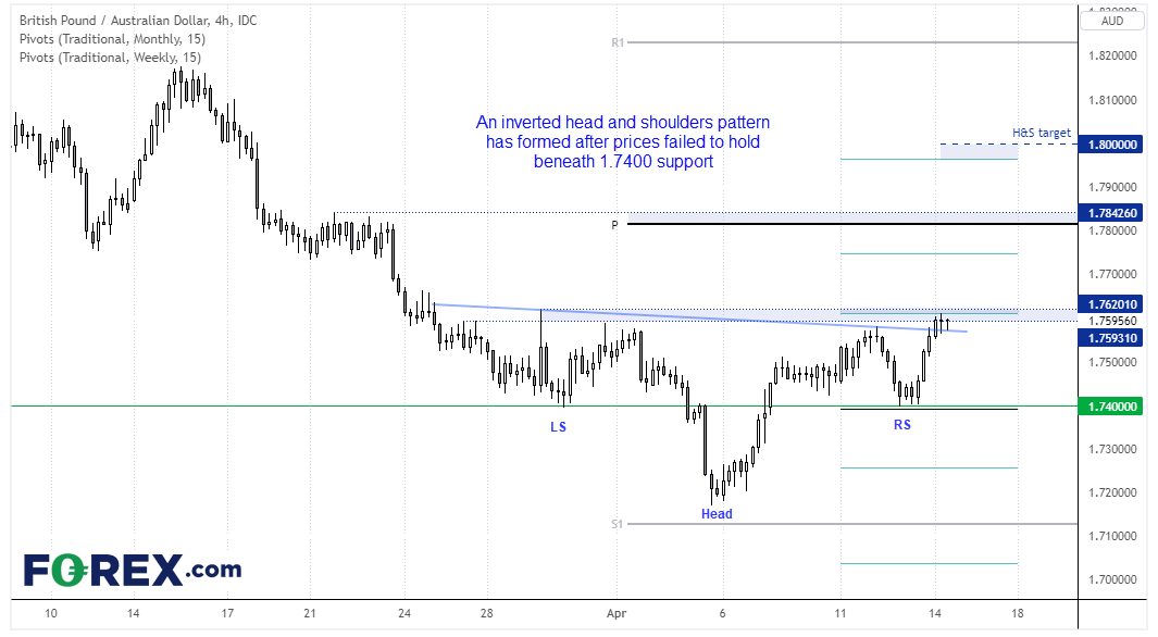 英镑/澳元过去两个月的下跌走势令人瞩目,但一直没有守住关键支撑位1.7400下方,现在反而呈现自其反弹的信号。我们可以看到价格在4小时图上形成了头肩底形态,大致目标在1.8000附近。请注意,公众假期之后将重设周图中枢点位(请看蓝色所示),但价格目前守在周图第一阻力位下方,期间目标在1.7745附近。如果攻克,可能上看月图中枢点位附近的1.7800和波段高点1.7842。