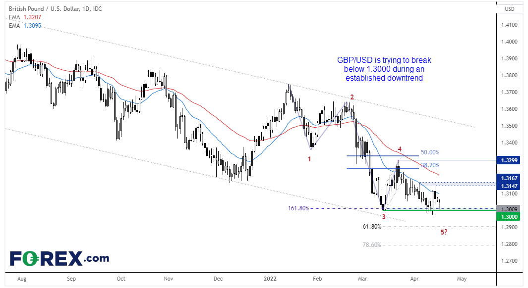 英镑也未能免于美元的威势,兑跌美元跌至3天低点并考验1.3000。两周前我们就阐述过看跌英镑的观点,当时我们指出,价格正在1.3200下方横盘。自那以后,该货币对形成两个下降的高点,最近的一个在1.3147,暗示价格准备于1.2900甚或1.2800完成第5浪。因为1.2900落在下跌通道的下轨趋势线,我们认为在该位结束第5浪的可能性更高,虽然还不能盖棺定论。
