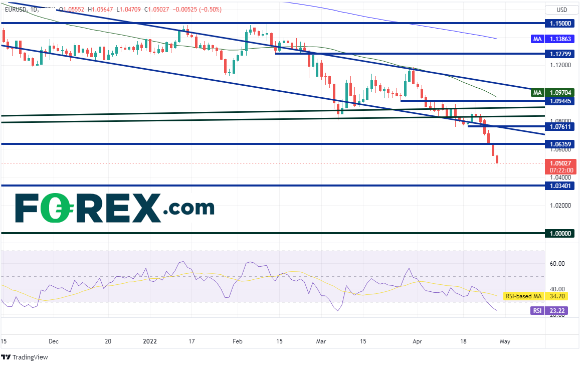 本月即将结束,美元指数日图呈现抛物线式走势,接下来直至105.41和2002年高点109.77才有阻力。第一支撑位也在较遥远的101.04,接着是4月21日低点和近期通道的上升趋势线99.82附近,然后是50天均线99.02。