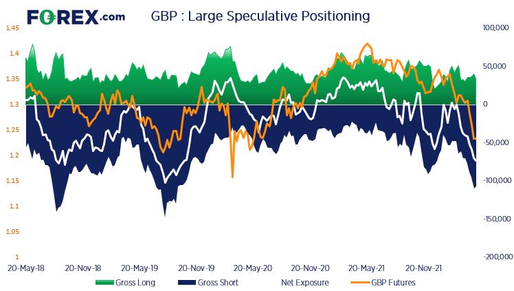 英国央行上周加息25个基点,但透露对未来18个月成长放慢以及通胀高企的担忧,导致英镑继续下滑。但因为是次会议于持仓报告编撰之后才召开,所以当前持仓报告或低估了交易员对英镑的空头持仓。如果按照周二的数据,交易者对英镑期货的空头持仓为2019年9月以来之最。从持仓情况看,英镑跌势或许过度。但从基本面判断,英镑或有更多下行空间。