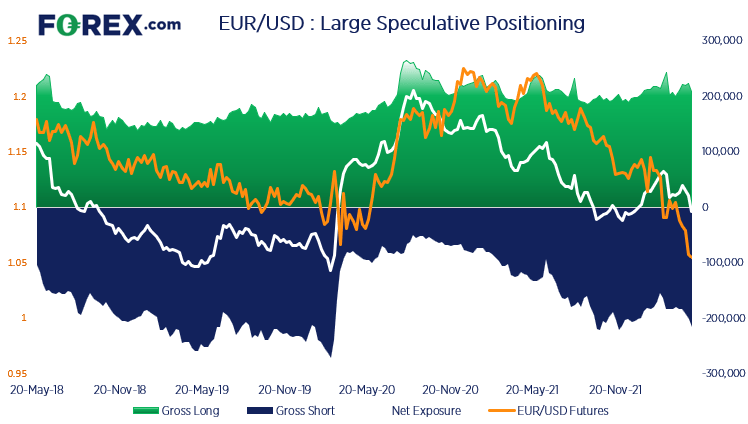 欧元自2021年1月触顶以来始终处于强劲的下跌趋势中,而交易者期间一直持有净多头,两相比较之下市场讶然。上周持仓情况自1月初以来首次转为净空头,但也只是减少了6378净多头持仓。有一个现象或可解释这一情况,即欧元似乎是不错的对冲货币,因为过去几个月里有大约20万张多头合约和20万张空头合约。所以,要想看到净空头显著增加,或需大型投机者了结总多头,减少对冲。契机或为美国10年期债券收益率断然站上2018年高点。