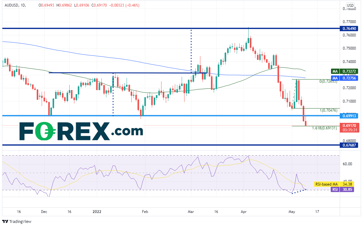 澳元/美元在2021年底和2022年初构筑双底并开始上扬,双底目标为突破位加上形态高度,本例中在2021年6月以来阻力位附近的0.7650。澳元/美元于4月5日到达目标,形成射日之星后开始下跌,此后一路走低且再未反攻。澳元/美元昨天击穿双底底部0.6990附近,今天继续走弱。支撑位在今天低点附近以及5月2日低点到5月4日高点行情的161.8%扩展位,即0.6913附近。如果失守,可能下看2020年6月以来支撑位0.6769。但请注意,RSI正与价格背离,表明价格或准备回升。阻力位在今天高点与前支撑位0.6991附近,如果攻克,有望涨至5月4日高点0.7265。