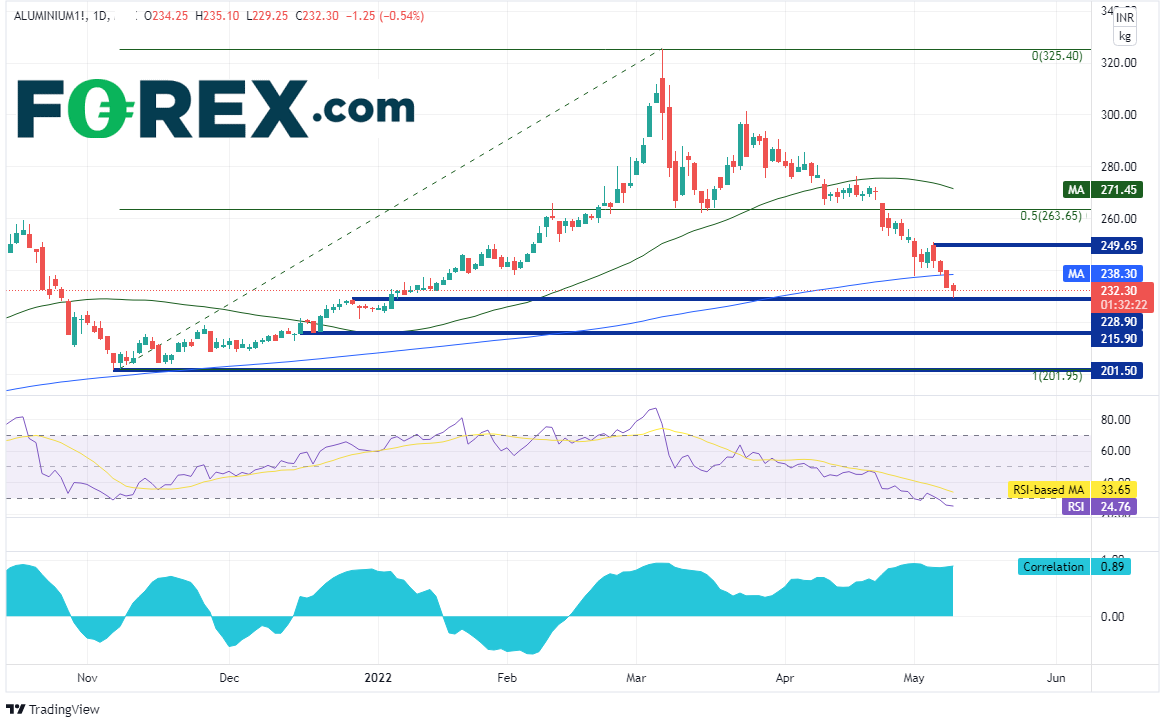 铝价于2021年11月初在200天均线201.50附近企稳,接下来的3个月里因通胀大涨而走高。该工业金属在3月7日创下325.40高点,那是在俄罗斯侵入乌克兰之后不久。对需求不足的担心开始渗入市场,导致铝价回撤至2021年11月8日低点到3月7日高点行情的50%回档位。而当铝价再次试图反攻时,中国因为疫情而加大封锁管控力度。具体来说,就是上海市的封锁管控再次令今后经济增长放慢的担忧升温。该金属在3月24日交投于301.4,昨天跌破200天均线238.30,今天交投于232.0附近。那么铝价后市会继续下跌吗?铝价目前落在水平支撑位228.90上方不远处,下方还有215.90水平支撑位,然后是2021年11月8日低点以来涨势的100%回档位201.50。但请注意,RSI处于超卖状态,表明铝价格或准备回升。阻力位就在上方的200天均线,然后是5月5日以来高点250.65。