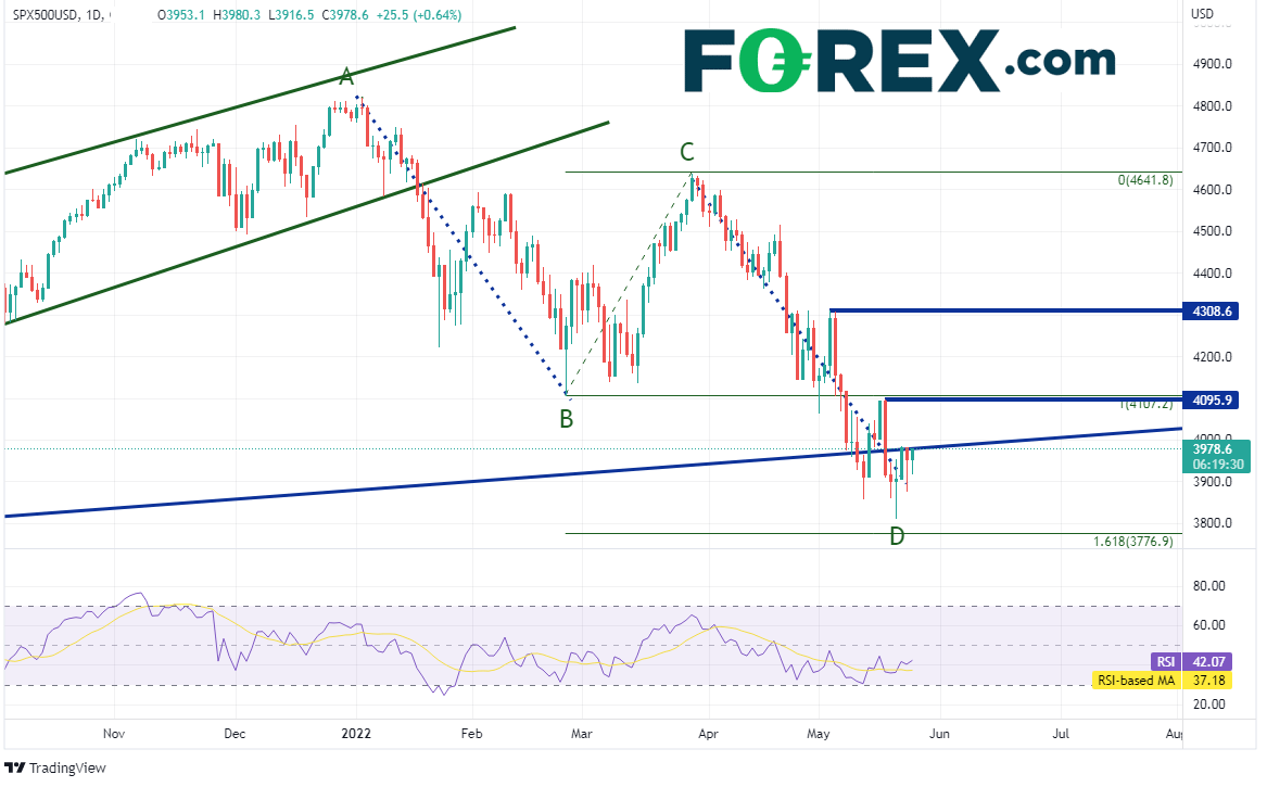 日线图上,标普500指数已于历史高点下方完成AB=CD等浪形态。此外,股指迄今守住2月24日低点至3月29日高点上行之161.8%扩展位3776.9。若下破,下个支撑位落在分别位于3500和3188的周线图50%回档和61.8%回档。但若短线支撑守住(周线图3811,日线图3776.9),价格真的反弹,则4096和4107之间构筑强大水平阻力。若拿下,价格或将攻向水平阻力位4308.6。