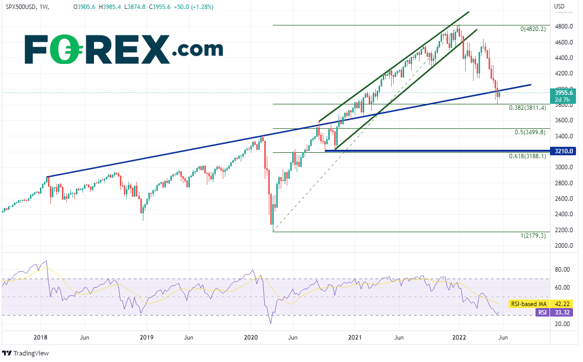 鉴于以上种种,标普500指数一直在走低。周线图来看,价格在2022年第一周创下4820.2历史新高,此后持续下挫。指数已较历史高点下跌了近18%。自2020年9月以来,该大盘股指数一直处于上升楔形结构中,但在1月17日当周急剧下穿楔形底部趋势线。上升楔体下破目标为楔体高度的100%回档位,即3210附近。但价格迄今已回落至(并保持在)2020年3月疫情低位至近期历史高点38.2回档位3811.4。在此过程中,标普500指数还下穿了3980附近一条2018年1月以来长期上升趋势线。