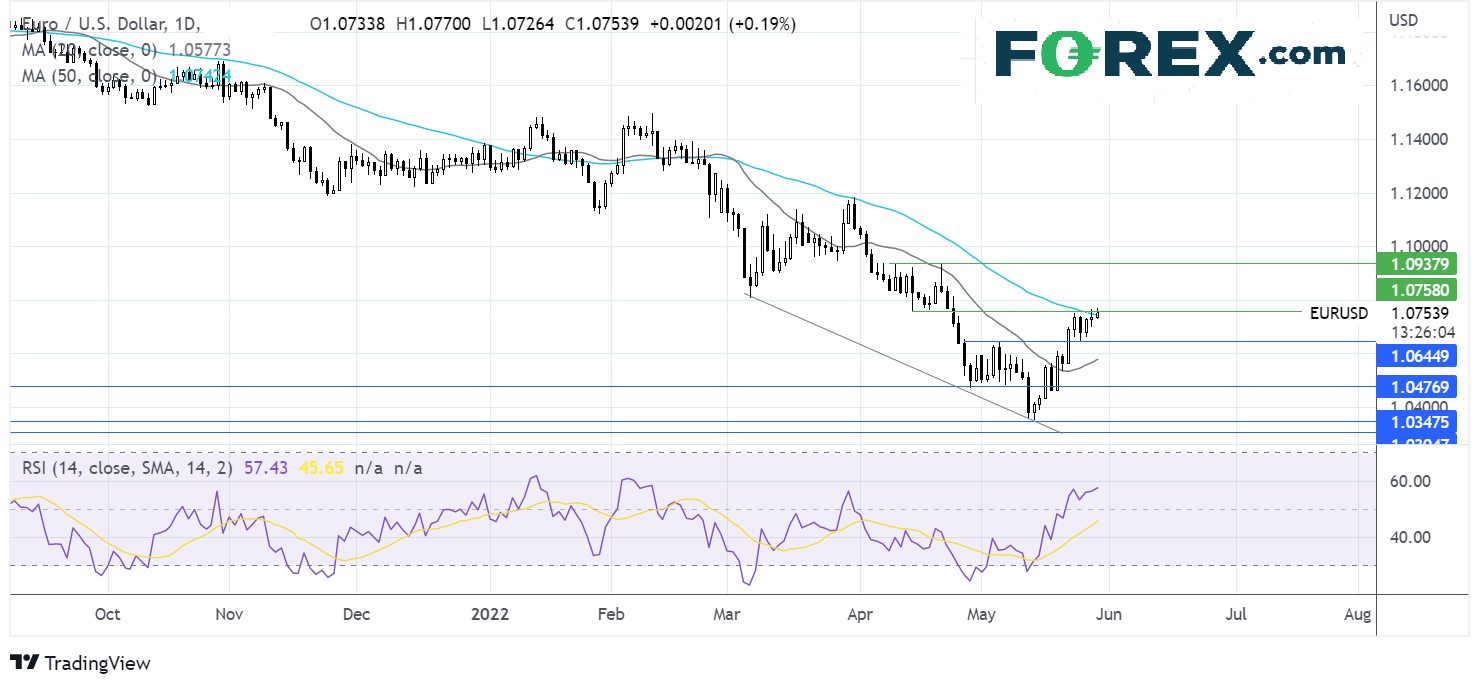 多头需要站上可能“难啃的骨头”,即50期均线和 4月14日低点1.0755。如果攻克,可上看4月后期高点1.0940。