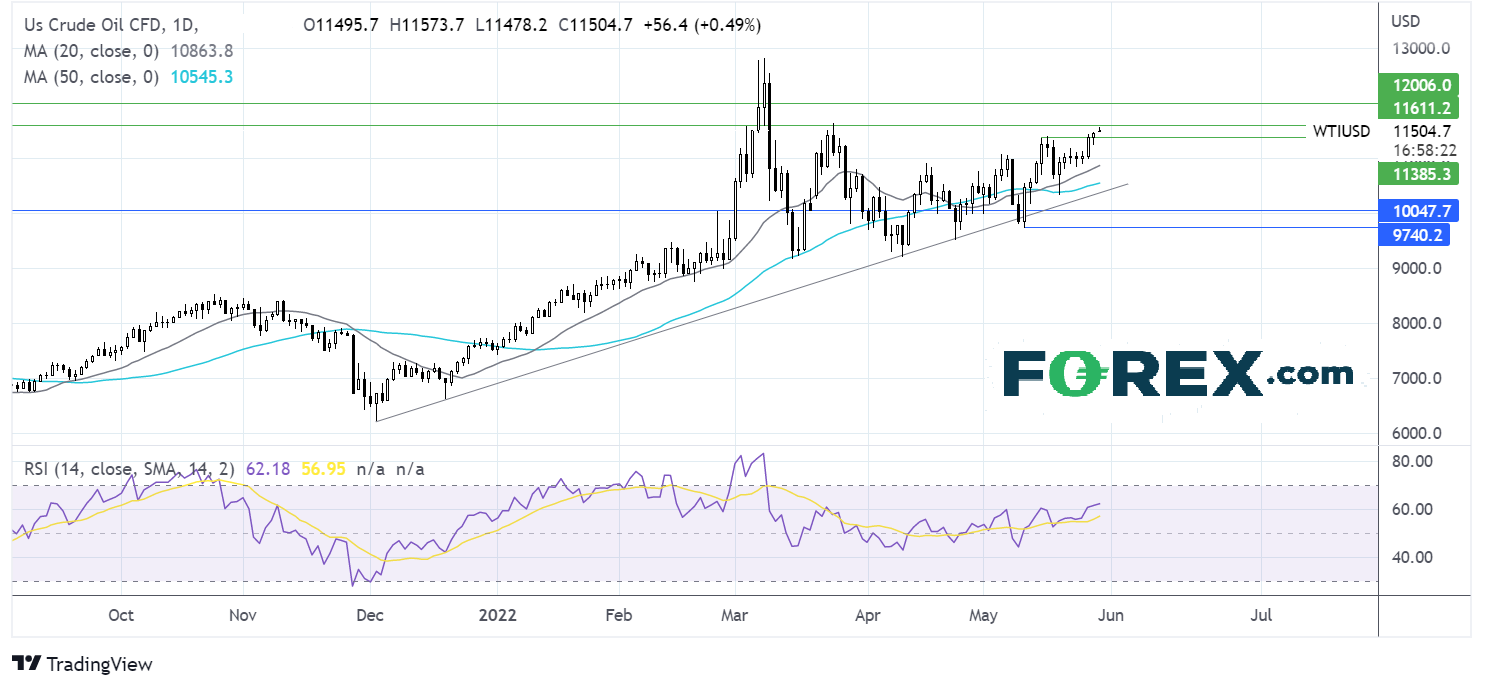 油价继续上涨,交投于持续数月的上升趋势线、20及50期均线之上,并且20期均线业已上穿50期均线,发出看涨信号。叠加RSI看涨,令多头寄希望于扩大上行。上攻120,需要站上3月24日高点构成的整数阻力。