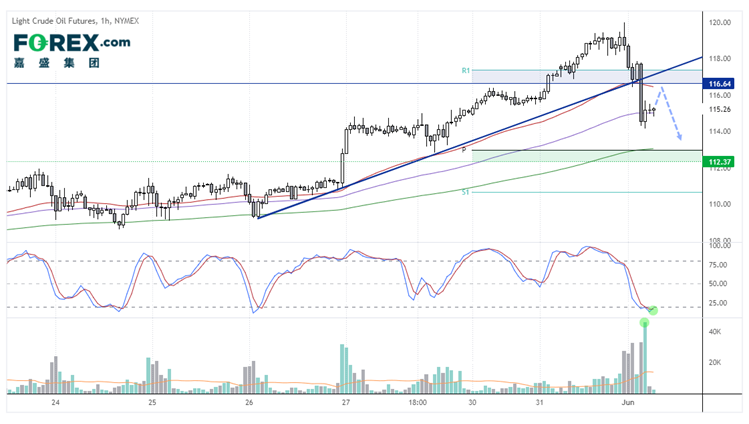 小时图显示价格突破趋势线后在100小时指数移动均线处企稳。价格挟高成交量形成阳线,并且随机震荡指标发出看涨信号。所以,我们怀疑价格可能先逆势反弹至116构筑波段高点,然后下探200小时指数移动均线与周图枢轴附近的113。