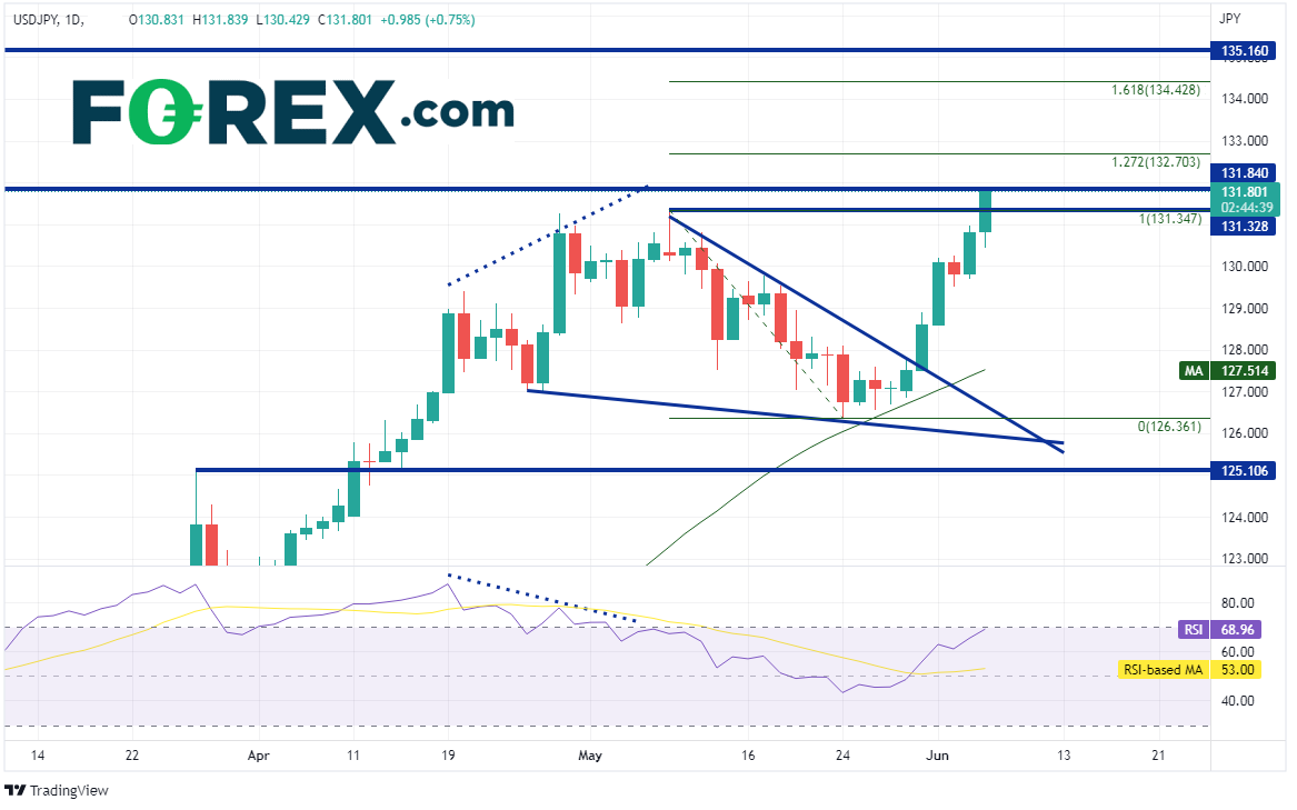 事实上,美元/日元确实一直在走高。日图价格于5月9日创下2002年4月以来最高点131.28后形成了下降楔形,此后的下跌守住了50天均线并在5月31日打破下降楔形并强力上攻再无疲态。美元/日元今天攻克5月9日以来高点,逼近2002年2月以来水平阻力位131.84附近。后市阻力在5月9日高点到5月24日低点行情的127.2%和161.8%扩展位,分别落在132.70和134.43附近。如果攻克,可能上看2002年1月以来水平阻力位135.16。如果受阻回落,下方无阻力,直至50天均线127.52,然后下看下降楔形的上轨下降趋势线所在的126.75附近、5月24日以来低点126.36。
