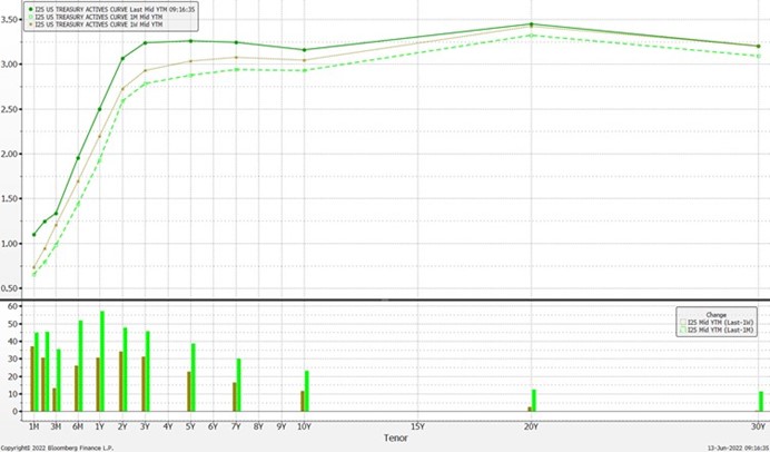 众所周知,通胀以及伴生的央行政策是市场当下的主要话题,但上周五公布的美国CPI数据激起了全面又强烈的反响,使得本周的FOMC会议格外引人瞩目。薪资增长没有跟上通胀是另一个隐忧,而美国2年期和10年期债券收益率曲线接近于倒挂,反映了市场的避险情绪,尤其是衰退忧虑引发的避险情绪。本周晚些时候我们将就央行政策方面的话题展开更多的讨论,重点关注新兴市场央行与黄金市场。