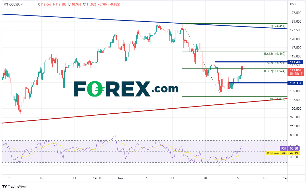 西得州原油4小时图回调至6月14日高点到6月22日低点行情的38.2%回档位,即111.52附近,上档阻力有6月21日以来高点113.40、前述行情分别落在113.99和116.46的50%和61.8%回档位。如果市场出现增产预期并导致油价下跌,则下档支撑位先后有周一低点107.33附近、6月22日低点103.53以及对称三角形的下轨上升趋势线(请看下图红色线)102.00附近。