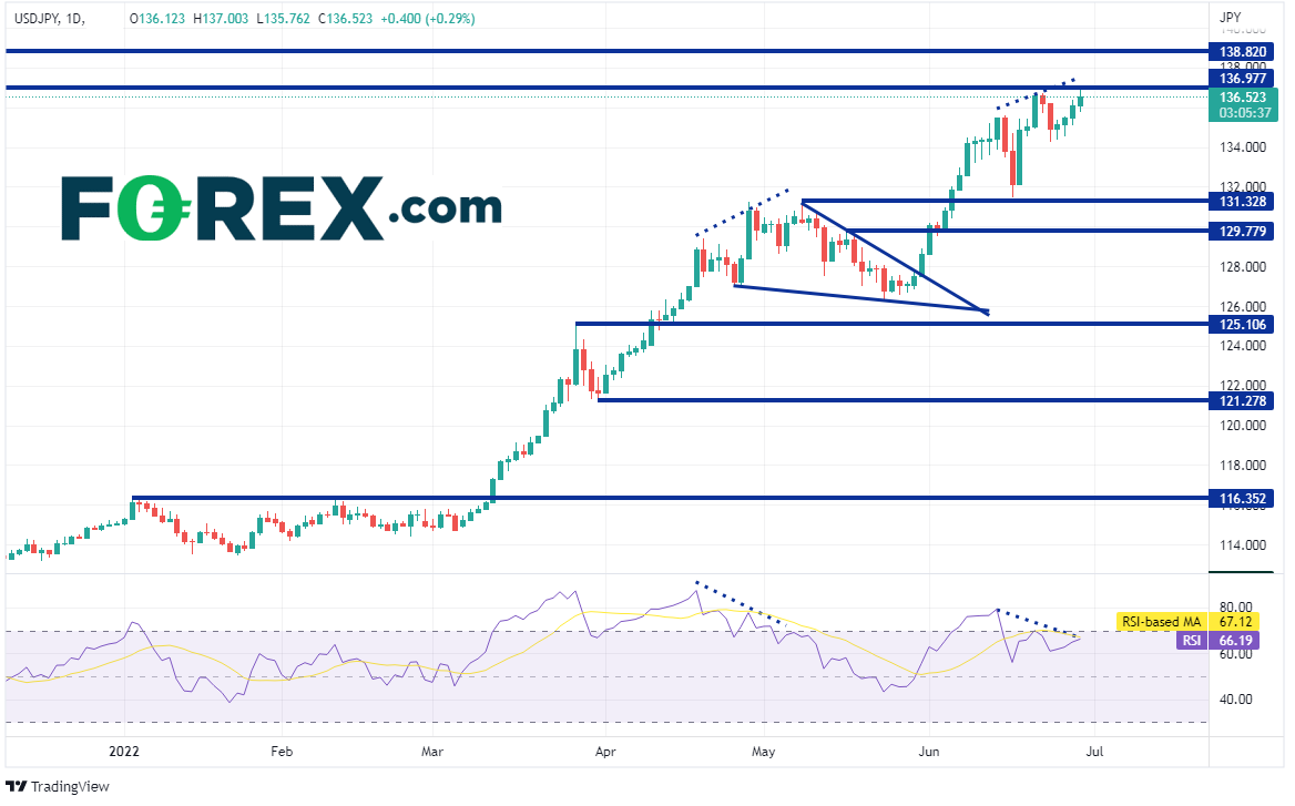 美元/日元从3月11日站上116.35开始大举冲高,在5月9日到达131.34高点,当时RSI开始在超买区域与价格背离。该货币对之后回落,形成下降三角形,缓解了RSI的超买压力。5月31日,货币对再次发力,最终在今天创下137.00新高。但请注意,RSI目前进入超买位,再次与价格背离,或警示价格又一次修正。