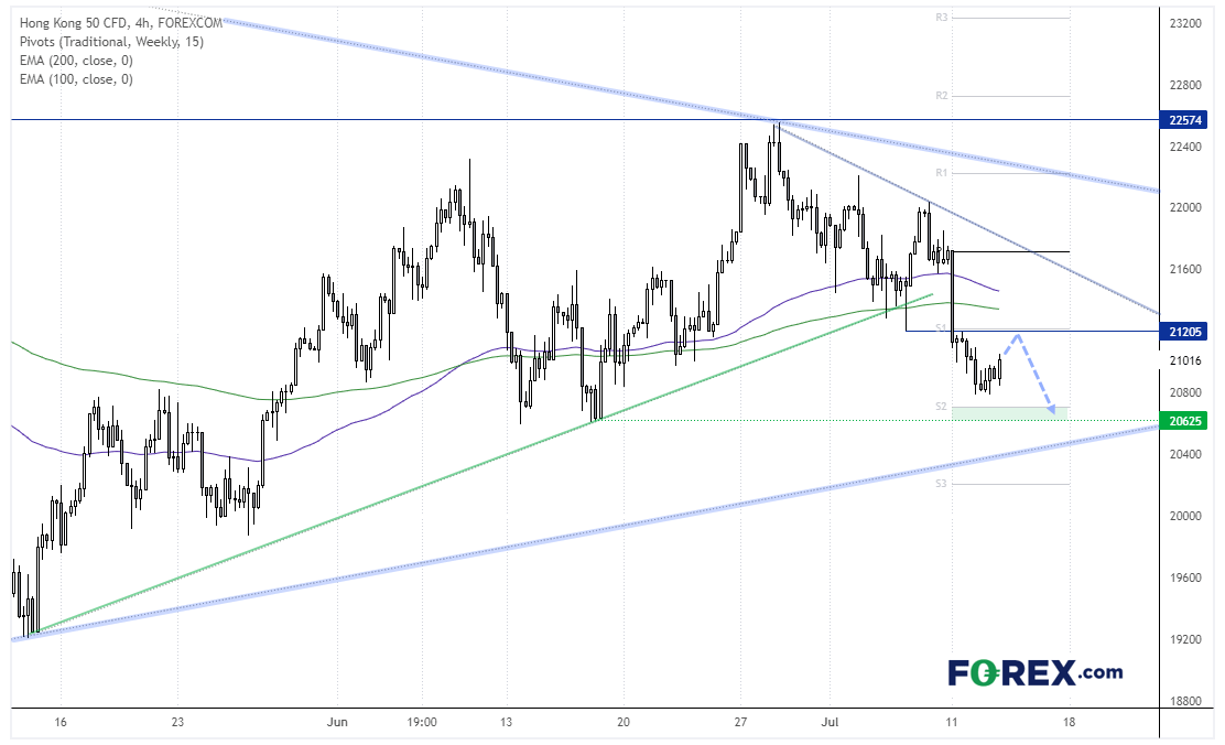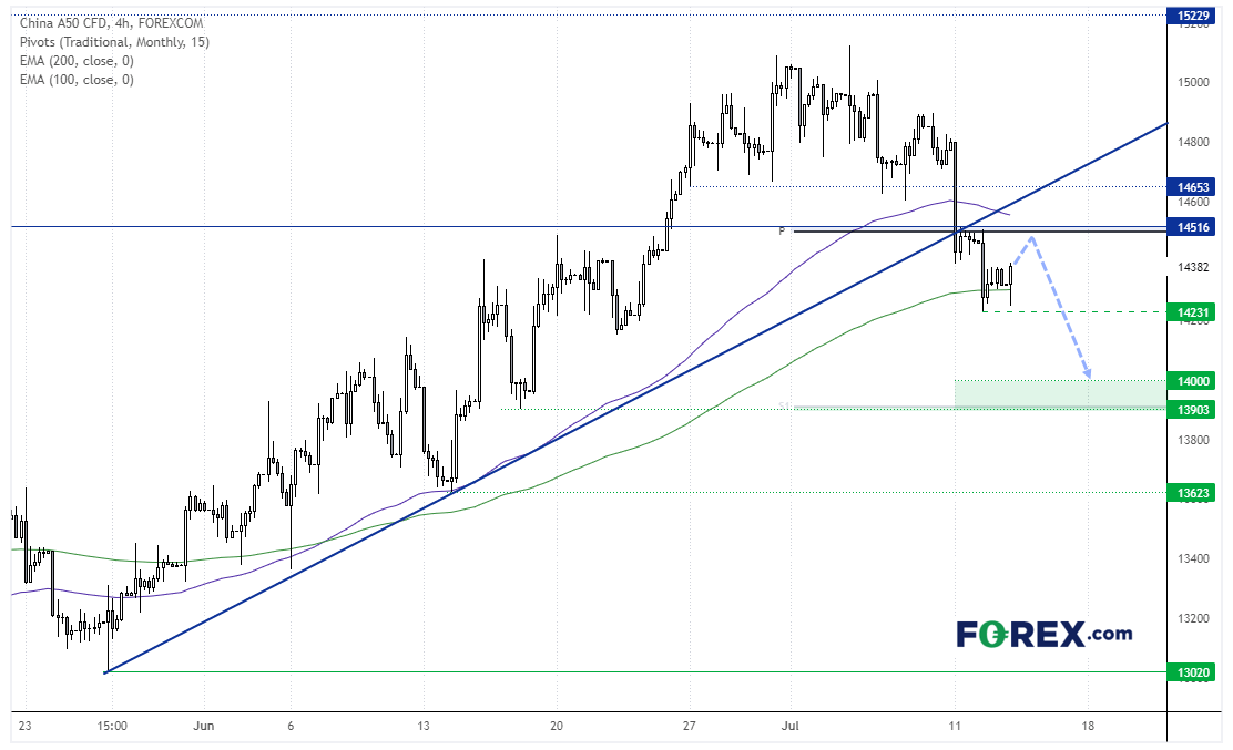 中国A50指数下破上升趋势线与月图枢轴点位,现正构筑潜在看跌旗形,但4小时图已于200期指数移动均线附近企稳。