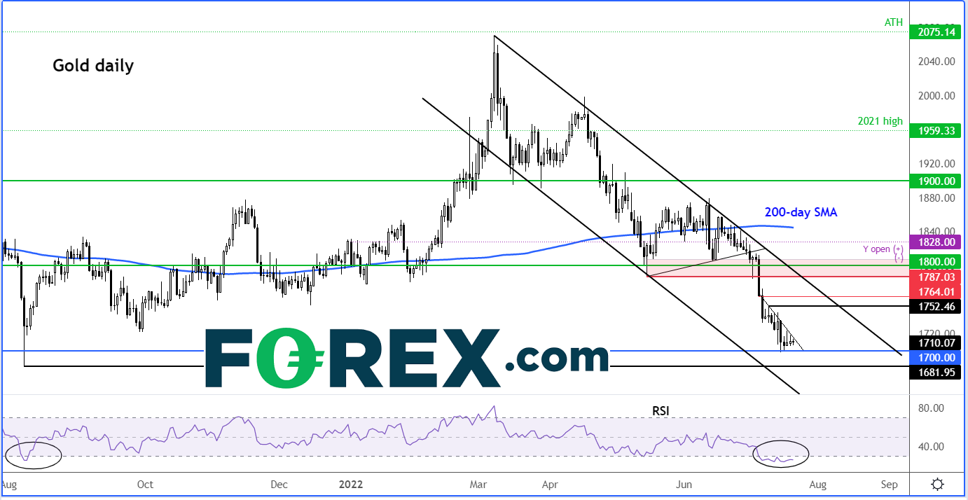 金价自3月高点2070暴跌18%,之后在过去几周于1700附近有所企稳。金价有机会在当前价位附近筑底,但到目前为止还没有任何相应的迹象。事实上,此文发稿时金价自时段高点回落,周线持平。多头期待着金价可以结束持续5周的连跌势头,但我们关注的是,金价有能力反弹吗?