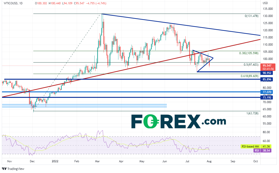 接连遭到中美负面制造业数据的打击,西得州原油价格不断下跌,当天跌幅接近5%。而供应端的OPEC+会议可能“保持不变或略微增产”前景,同样无助于支撑油价。如果西得州油价无法回到短期对称三角形的下轨趋势线所在的98.50附近之上,后市或一路下滑至7月14日低点90.95。