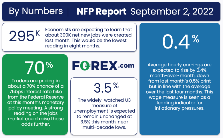 对于美联储将要发布的政策决议还存在的一些模糊不清的地方,本月的非农就业报告有可能消除不确定性,几乎确认将加息75个基点,亦可能再度令人迷惑,重新给决议蒙上不确定性迷雾。简单来说,任何市场的交易者都面临很高的风险。对于8月非农就业报告,主流预期是净新增29.5万,而平均每小时收入月率上涨0.4%。