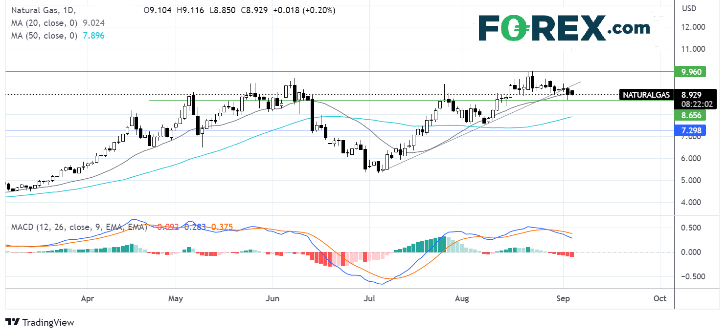 天然气价格在9.969遇阻后回落,期间跌破了持续数周的上升趋势线,叠加MACD看跌,空头可望扩大地盘。