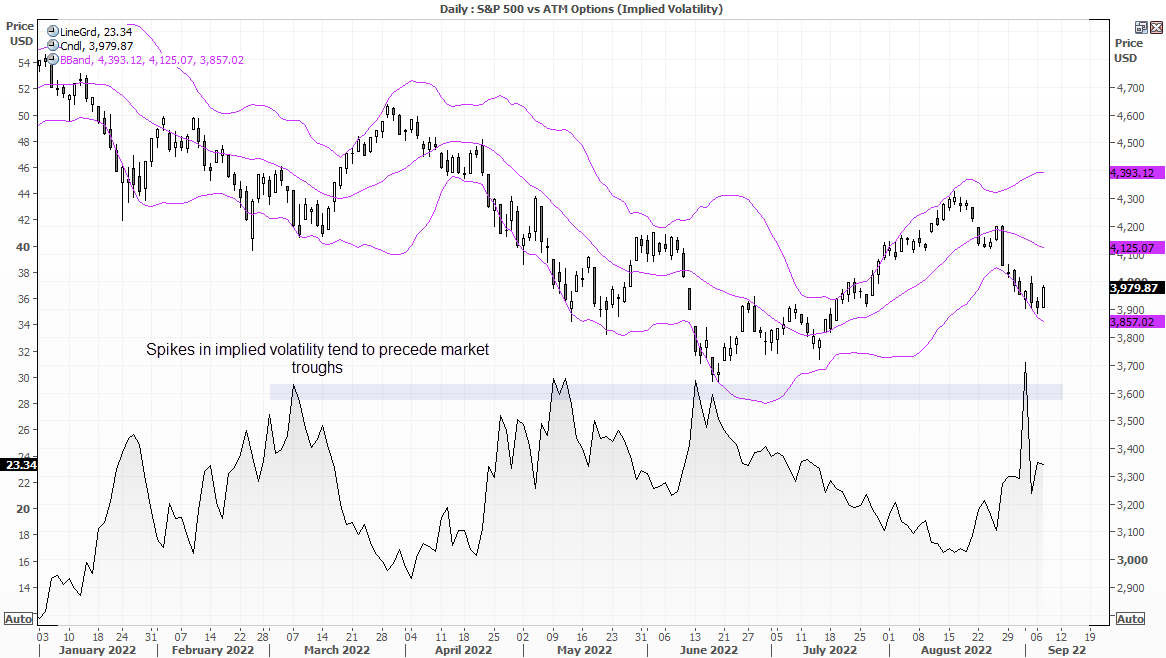 每当标普500指数的价内期权上升至28-30区域时,基本上也是股指创下周期低点之际。这并不是一个优秀的计时工具,但一般发生在低点就位之前 并没有准确指示低位可能有多低。但图表上近期的探底上冲最为强劲,并且标普500指数和道指一样,呈现潜在筑底的信号。而且,股指交投于布林带下轨附近。如果我们把思路拓宽,看得更远些,那么第2浪的幅度往往最大 并且反弹往往肇始于不确定期。在这样的背景下,道指(乃至整个美国股市)成为逆势看多交易者的候选交易对象。