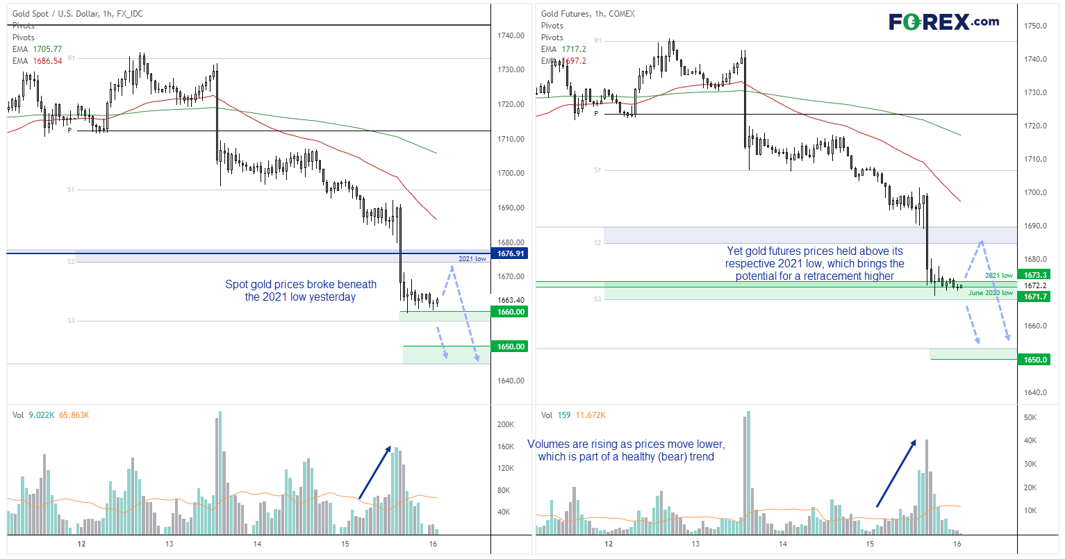 现货黄金昨天坚定收于2021年低点下方,可能吸引很多亚洲交易员今天察看图表并引发新一轮抛售潮。如果放大对黄金的观察视野,没人会指责交易员们的仓仓皇出逃。