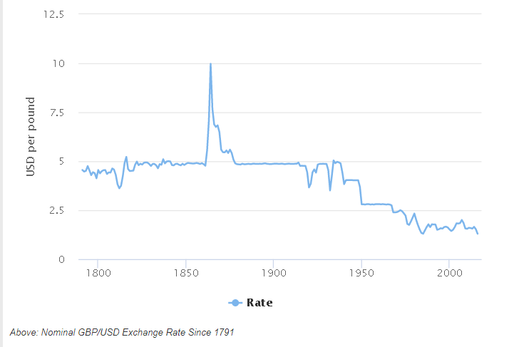英镑/美元在整个19世纪都交投于51左右,但过去半个世纪整体不断下跌。英镑和美元两者的价值最接近的时候是在1985年,当时英镑/美元一度跌破1.10。请看下图。