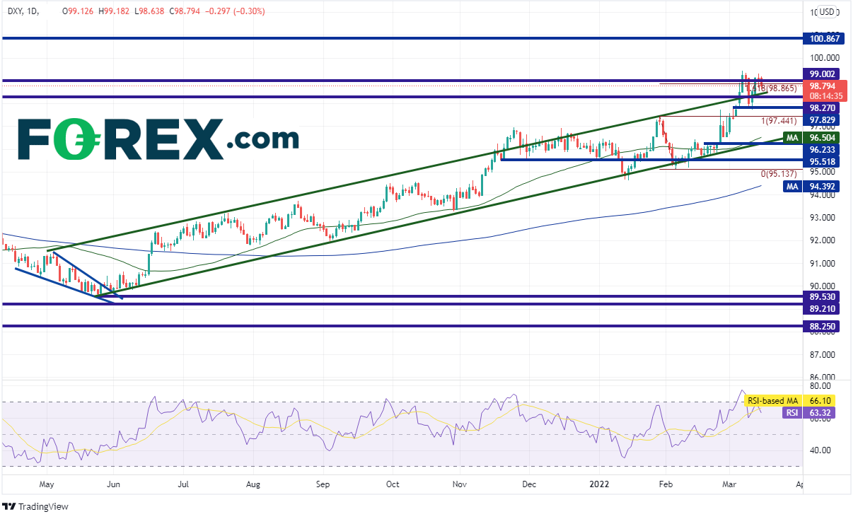 美元指数自2021年5月底以来有序走高并形成上涨通道,上周创下2020年5月以来最高点99.42,站上了通道的上轨趋势线,尾盘一度尝试回到通道内但以失败告终,目前的阻力在1月29日高点到2月4日低点行情的161.8%扩展位98.96附近。