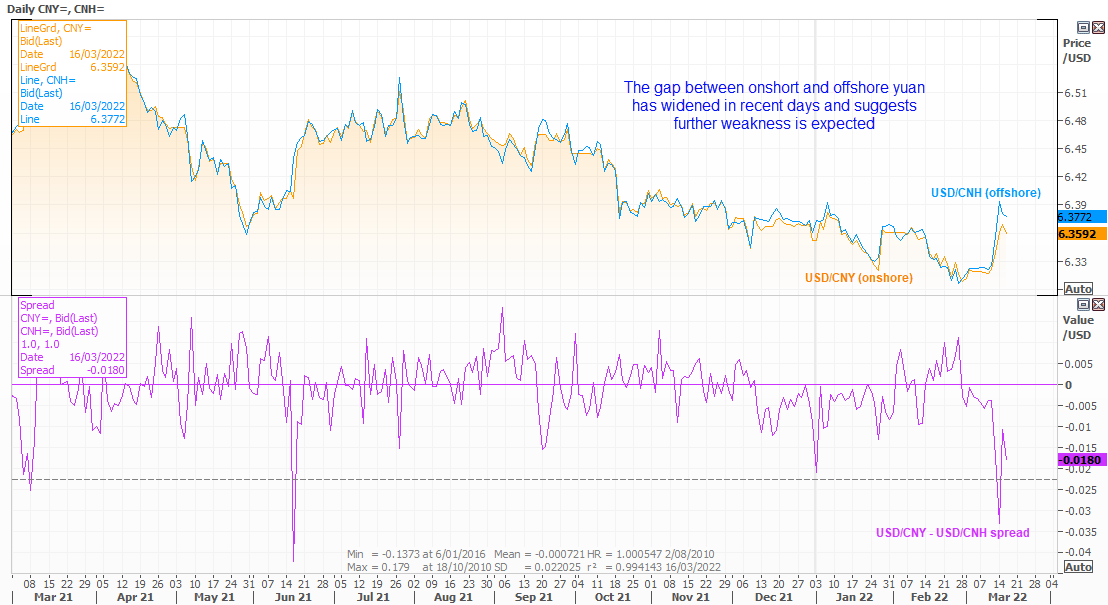 离岸人民币汇率因此低于在岸人民币,表明交易者认为人民币汇率可能进一步贬值 – 至少短期内可能进一步下跌。另外,在岸与离岸汇率差在周初创下9个月最高点。