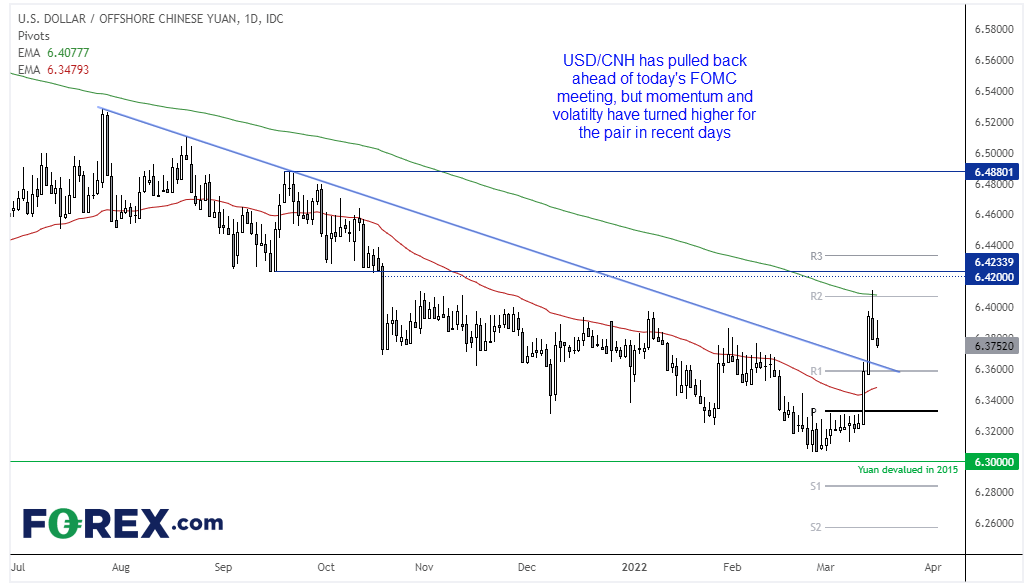 而如果美联储强硬式加息,美元/离岸人民币本周低点或已就位,后市第一步上看6.4200并且暂时受制于该潜在中枢价位。如果攻克6.4240,可能打开上攻6.500的空间。到时我们将扩大视野,观察2月低点是否确实数月低点。