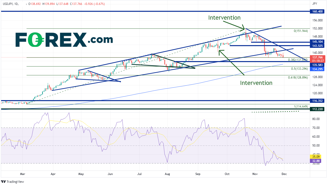此次鲍威尔鸽派转向的最大受益者是日元。美元/日元自1021日日本财务省最后一轮干预后,从高点151.95不断走低。1110日单日内下跌545点。不过跌势在913日低点至1013日高点的38.2%回档位137.70附近暂停。鲍威尔的讲话能否刺激货币对进一步下跌?