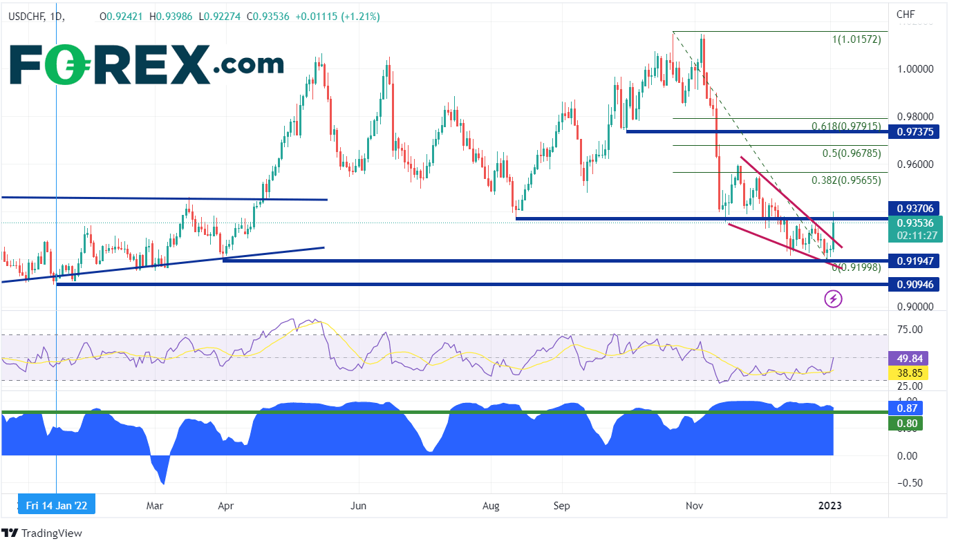 美元指数(DXY)在2023年的第一个交易日打响了第一炮。由于DXY与美元/瑞郎的相关性很强,因此该货币对也随之走高。DXY会继续走高吗?如果走高,只要强相关性成立,美元兑瑞郎应该也会走高。
