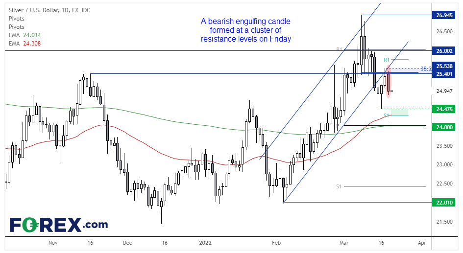 我们曾指出,白银日图有波段做空机会。银价上周打破上涨通道后回调至破败趋势线并受阻,周五于38.2%回档位构筑看跌吞噬K线,表明波段高点已就位,构成了3浪逆势行情的一部分(其中第2浪于周四形成高点后结束)。受制于25.54我们继续看跌,目标包括周三低点及24.00。在周五区间内展开小级别回调时再逢高做空可以改善风报比。