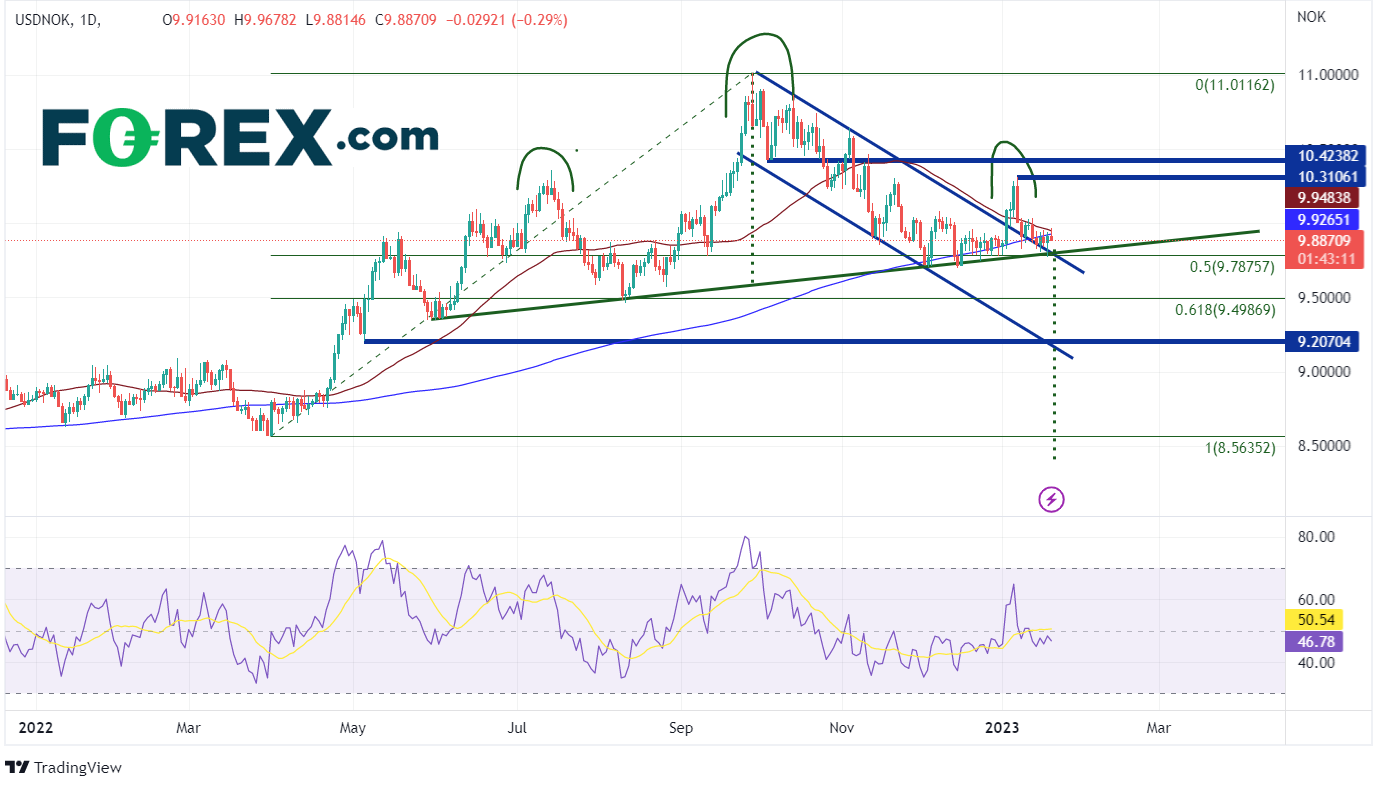 从2022年3月31日到2022年9月28日,美元/挪威克朗一直大幅走高,最高达到11.0116。此后,价格在通道中稳步走低,直到12月在9.7876附近的支撑位止跌。该支撑位由200日移动平均线、通道的底部趋势线以及从2022年6月初的低点形成的上行趋势线共同构成。通常情况下,当价格未能跌破通道的一侧时,它会移向另一侧进行测试。1月3日,价格向上突破通道上沿9.9987附近。然而,三天后,价格创下10.3106的高点并反转。美元/挪威克朗目前在50日移动平均线、200日移动平均线、通道顶部趋势线、自2022年6月以来形成的长期上行趋势线以及从3月31日低点到9月28日高点区间的50%回撤位9.8900附近盘整。