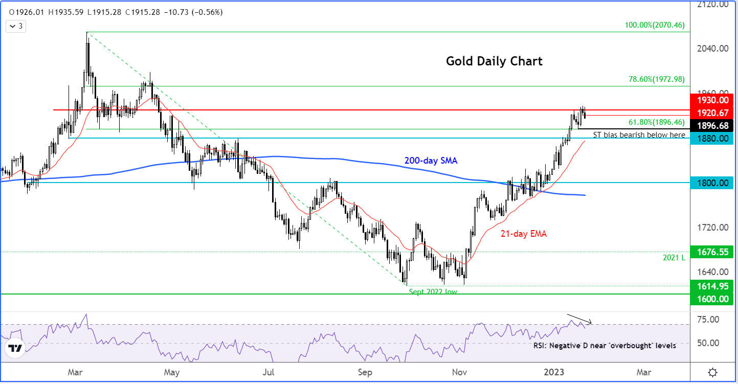 美元指数近期测试2021年至今升势50%回档位后,黄金交易者需要密切关注美元。DXY指数的抬高高点或会给黄金带来抛压。