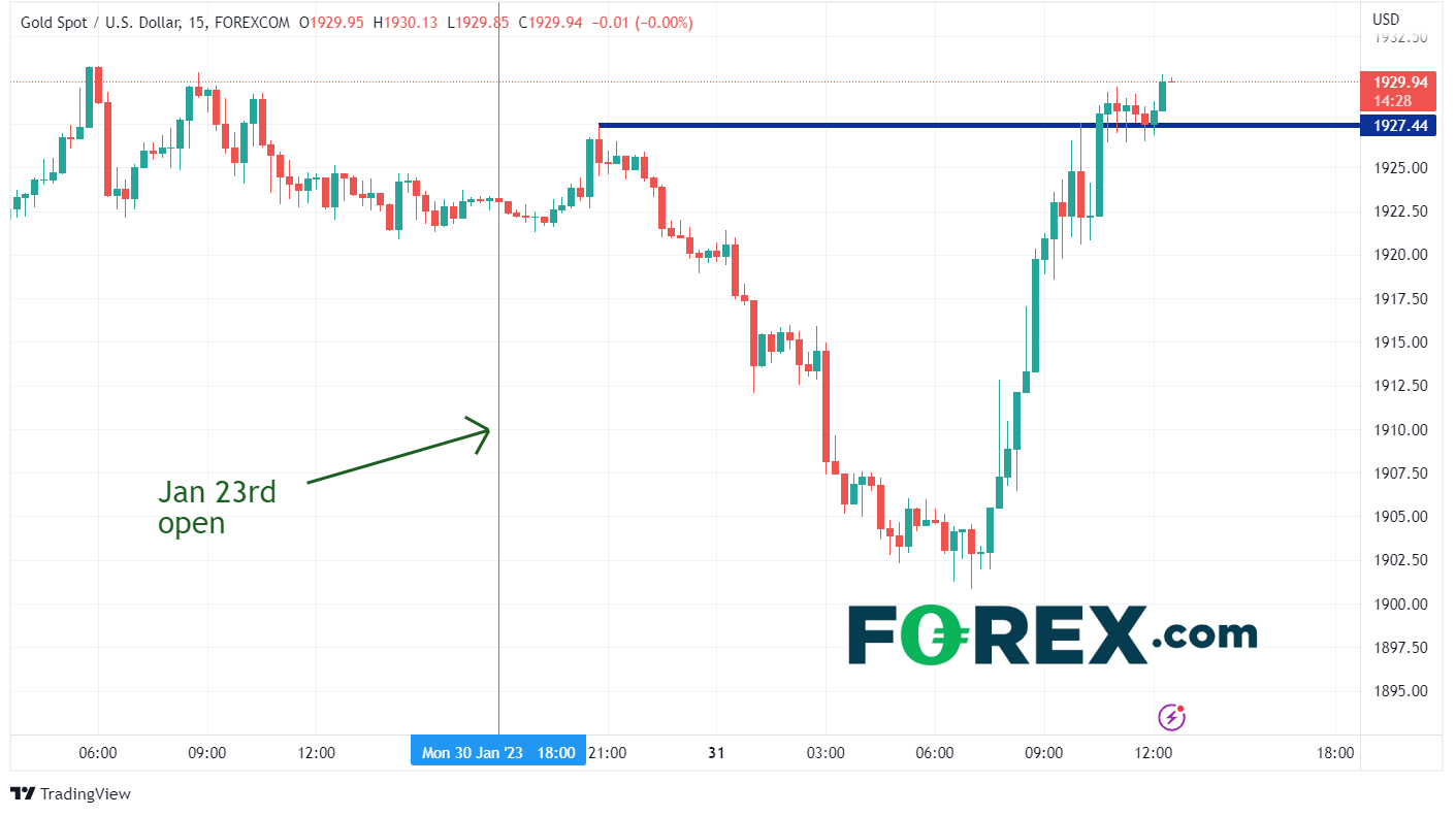 当周二早上美国市场开盘后,黄金(XAU/USD)遭到打压。该贵金属已经下跌超过20美元至1900美元附近,而且看来在美国交易时段的走势已定。然而,在美国雇佣成本指数发布前一小时,黄金开始走高。当美国东部时间上午8:30公布的ECI弱于预期时,黄金又回到了1912.11。弱于预期的ECI(1.1%,预期为1.2%)推动美元走低,市场希望工资增长放缓促使美联储在明天的FOMC会议上偏鸽。随着美元走低,黄金开始有所动作,完全扭转了隔夜走势并创出日内新高。