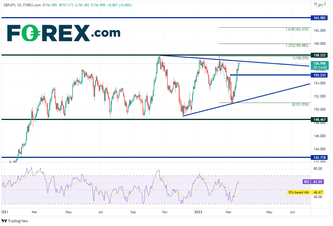 英镑/日元自2021年2月以来就一直交投于由148.47-158.20宽幅区间构成的横盘通道内,但从10月初开始高点下降且低点上抬,形成对称三角形。该货币对目前测试对称三角形的上轨趋势线157.30,如若攻克,可望摸至通道上轨趋势线158.22附近,然后是3月10日高点到3月8日低点行情的127.2%和161.8%扩展位,分别落在159.98和162.42。如果受制于上轨趋势线,下看3月3日高点155.23、对称三角形下轨上升趋势线151.25附近。如果下破,下个支撑位在3月8日低点151.04以及横盘通道的下轨148.57。