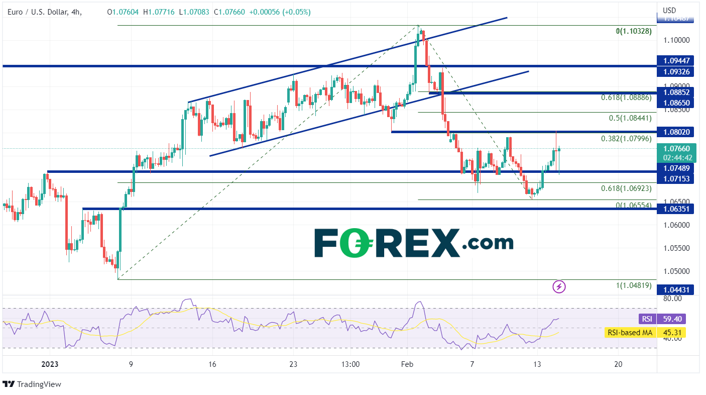 1月美国CPI高于预期,但低于12月数据。由于FOMC会议要到3月22日才会召开,美联储将有更多的通胀数据可供参考。因此,美元目前看来将在区间内震荡。但是,请密切关注支撑位和阻力位。如果价格涨破或跌破这些点位,美元指数和欧元/美元可能会形成走势。