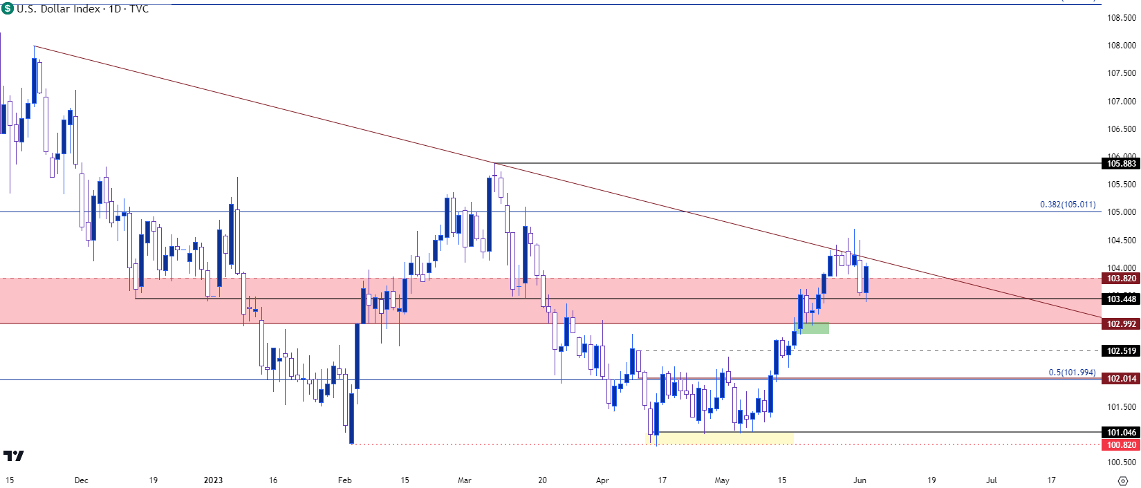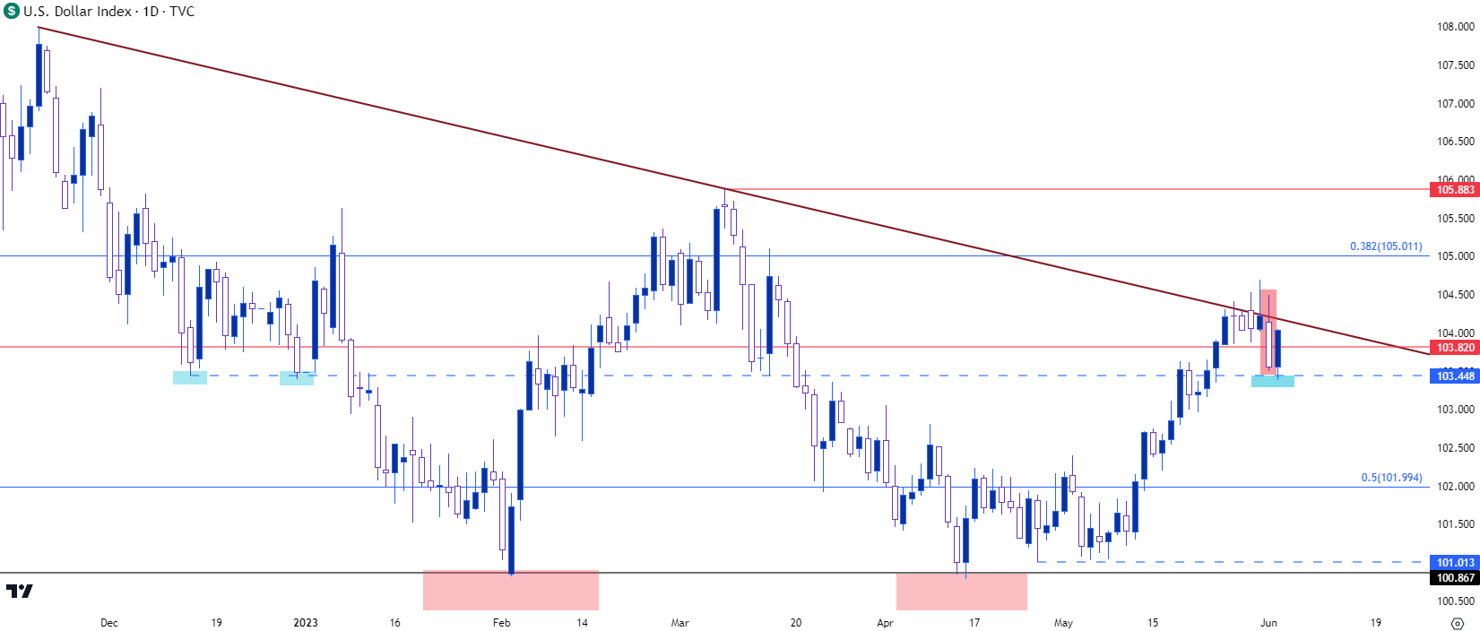 这条趋势线在上周开始发挥作用,我在5月26日星期五写到过。这一趋势线在整个星期都力阻多头,直到周四前每天都在经受测试。不过周四上午,空头开始搅局,强力推动下行走势,最终将DXY压至熟悉的103.45点位进行支撑测试。