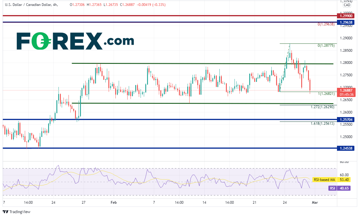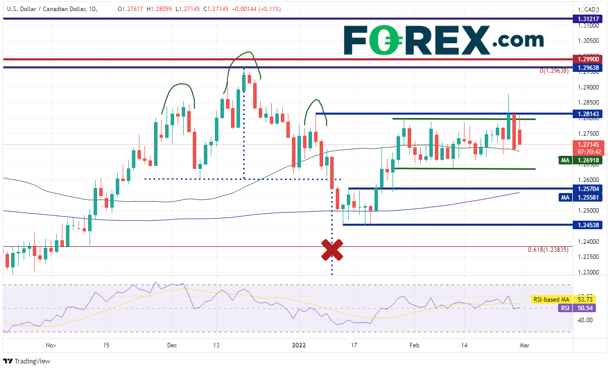 美元/加元日图在1月初冲击头肩顶形态的目标失败后回升,2月则交投于1.2636-1.2797的狭窄区间内。俄罗斯入侵乌克兰催生美元避险买盘,推动该货币对短暂升至前述区间上方的1.2878。但美元/加元之后迅速调头向下回到横盘区间内。